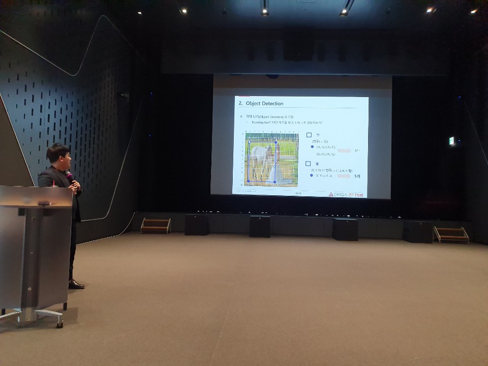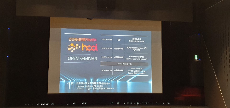 2020년 1월 31일에 한화빌딩 3층 Auditorium 에서 HCAI Open Seminar가 진행되었습니다. 이번 세미나는 기존 연구실 내부 세미나와는 다르게 한화시스템에 김성범 교수님과 DMQA 연구원들이 방문하여 한화시스템 임직원분들과 함께 듣는 강연 형식으로 진행되었습니다. 먼저 김성범 교수님께서 'HCAI Open Seminar 소개 및 AI 연구 동향'을 주제로 HCAI 공동연구센터 개소 이후 연구 성과와 다양한 산업분야에서의 AI 연구 동향 및 활용에 대하여 소개해주셨습니다. 다음으로 이창현 연구원이 'How to Regularize Machine Learning Models'를 주제로 머신러닝 모델의 과적합 문제를 해결하기 위한 다양한 방법론에 대하여 세미나를 진행해주었습니다. 마지막으로 조용원 연구원이 'Introduction to Object Detection and Image Segmentation'을 주제로 객체 탐지, 이미지 분할에 대한 전반적인 소개와 함께 Faster R-CNN, FCN, Mask R-CNN 모델에 대하여 설명해주었습니다 .좋은 세미나를 진행해주신 김성범 교수님과 이창현/ 조용원 연구원, 그리고 이번 세미나의 진행을 준비해주신 한화시스템 관계자 분들 감사합니다!