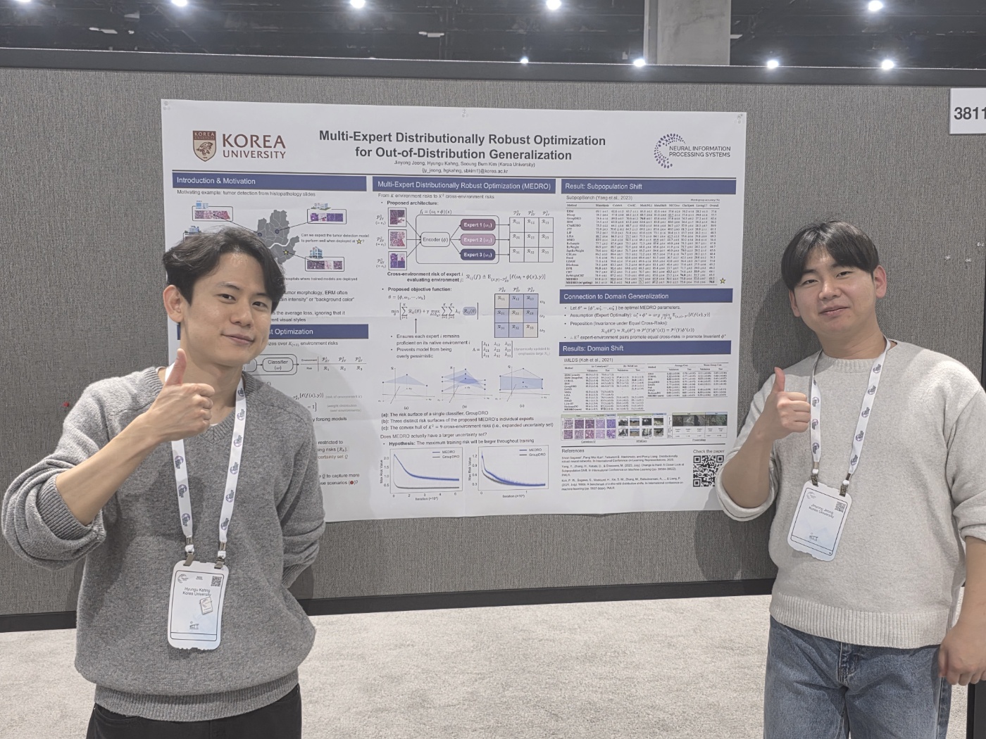 2025년 12월 3일부터 5일까지 미국 샌디에고에서 열린 NeurIPS (Conference on Neural Information Processing Systems) 학회에 정진용 연구원과 연구실 졸업생이신 강현구 교수님이 참석하였습니다. 이번 학회에서는 거대 언어 모델과 비전-언어 모델, 그리고 이를 활용한 에이전트 모델링 등 응용 기술들부터, AI의 본질적인 추론 능력이나 지능 등에 대한 탐구까지 최첨단 주제들이 폭넓게 다루어졌습니다. 세계적인 규모의 AI 학회답게, 현장에서는 전 세계 연구자들의 뜨거운 열기를 느낄 수 있는 뜻깊은 자리였습니다.