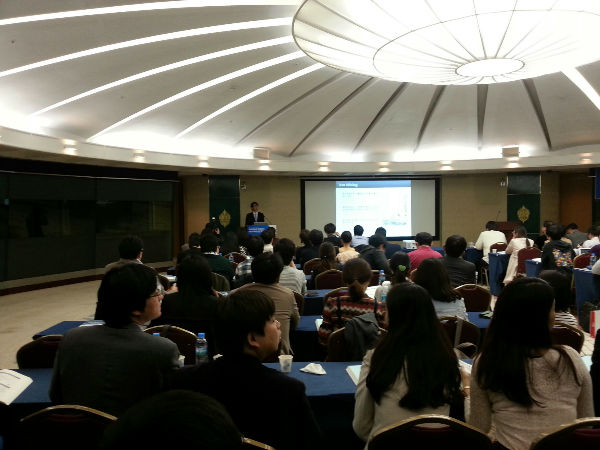 오후 학술 세션의 첫 발표를 맡은 조수곤 박사 과정 학생의 '소셜 네트워크를 이용한 핵심문장 탐색' 발표