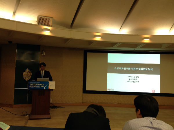 우리 DMQM 연구실에서는 박사과정 조수곤 학생이 '소셜네트워크를 활용한 핵심문장 탐색'이란 주제로